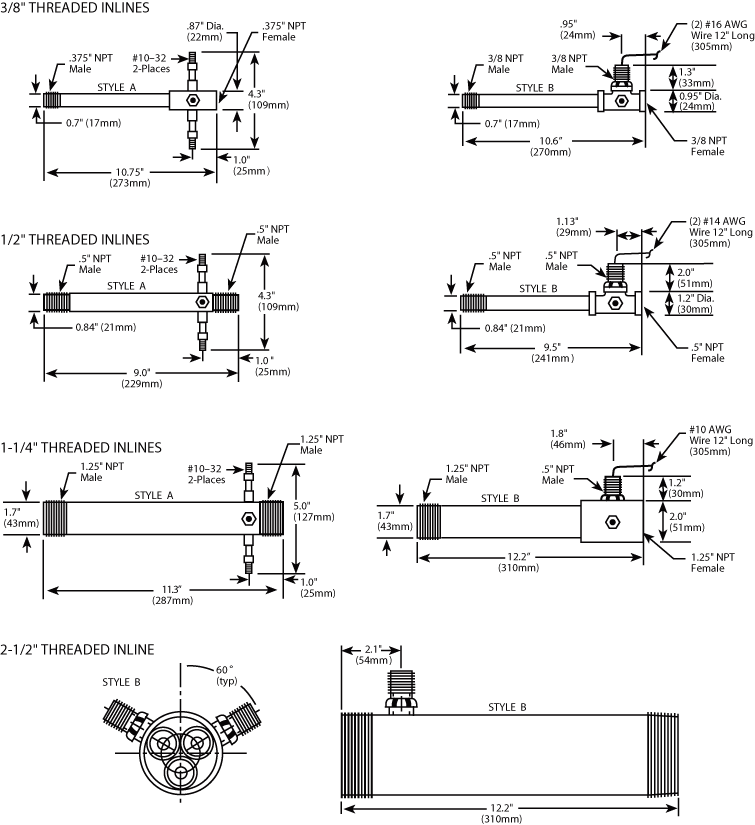 · Both ends threaded 3/8", 1/2", 1-1/4", and 2-1/2" NPT